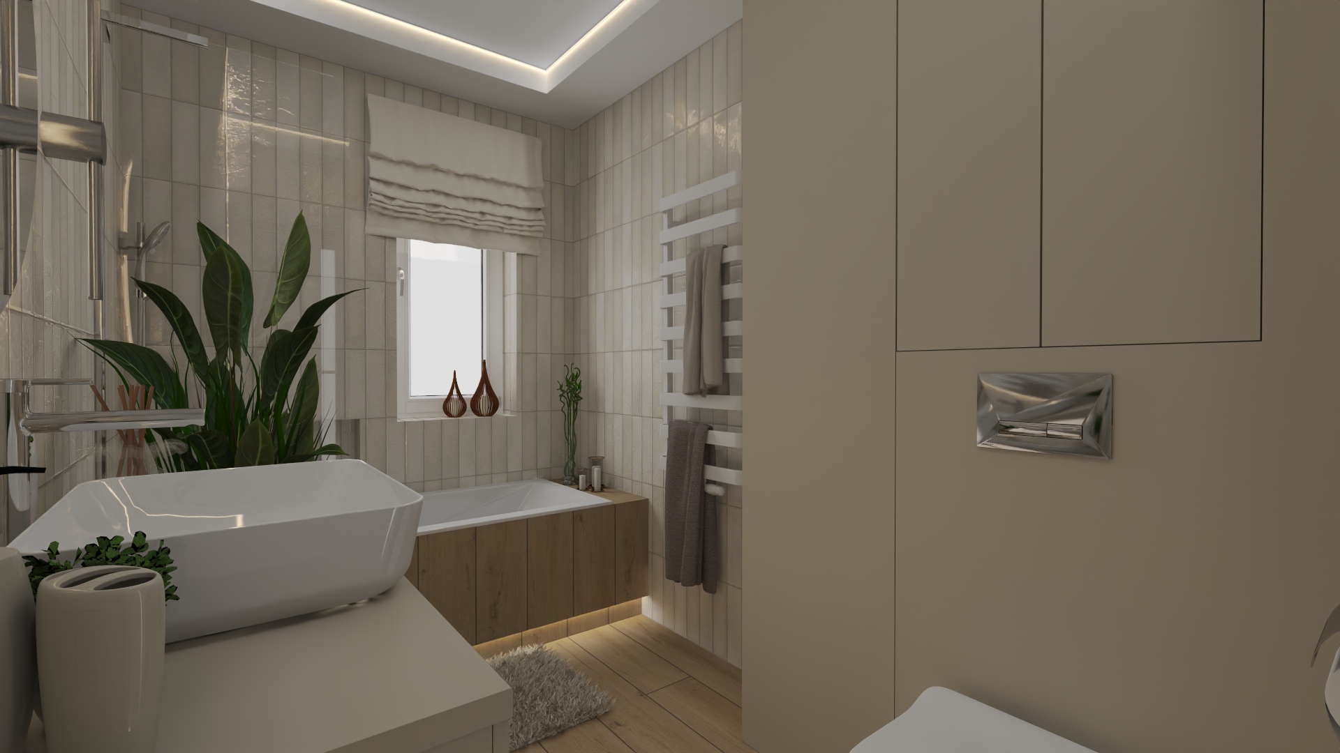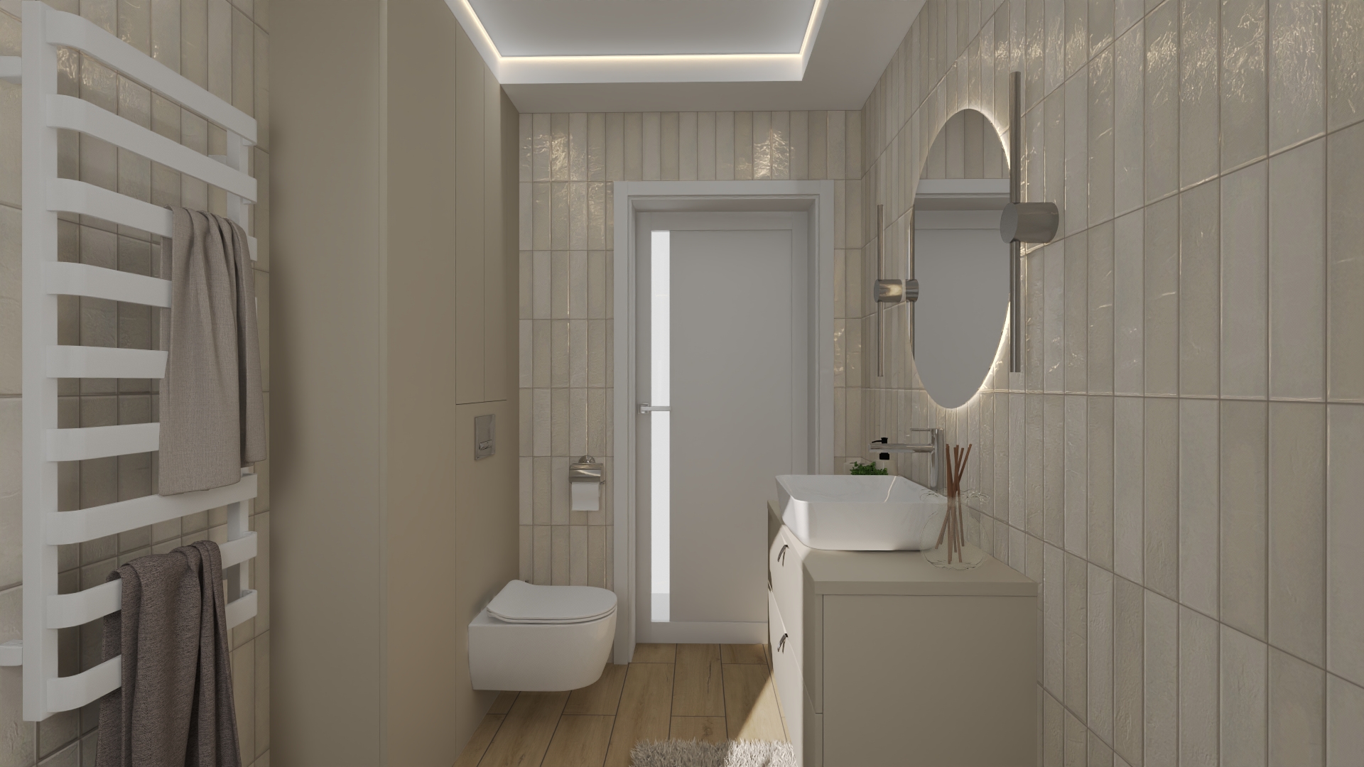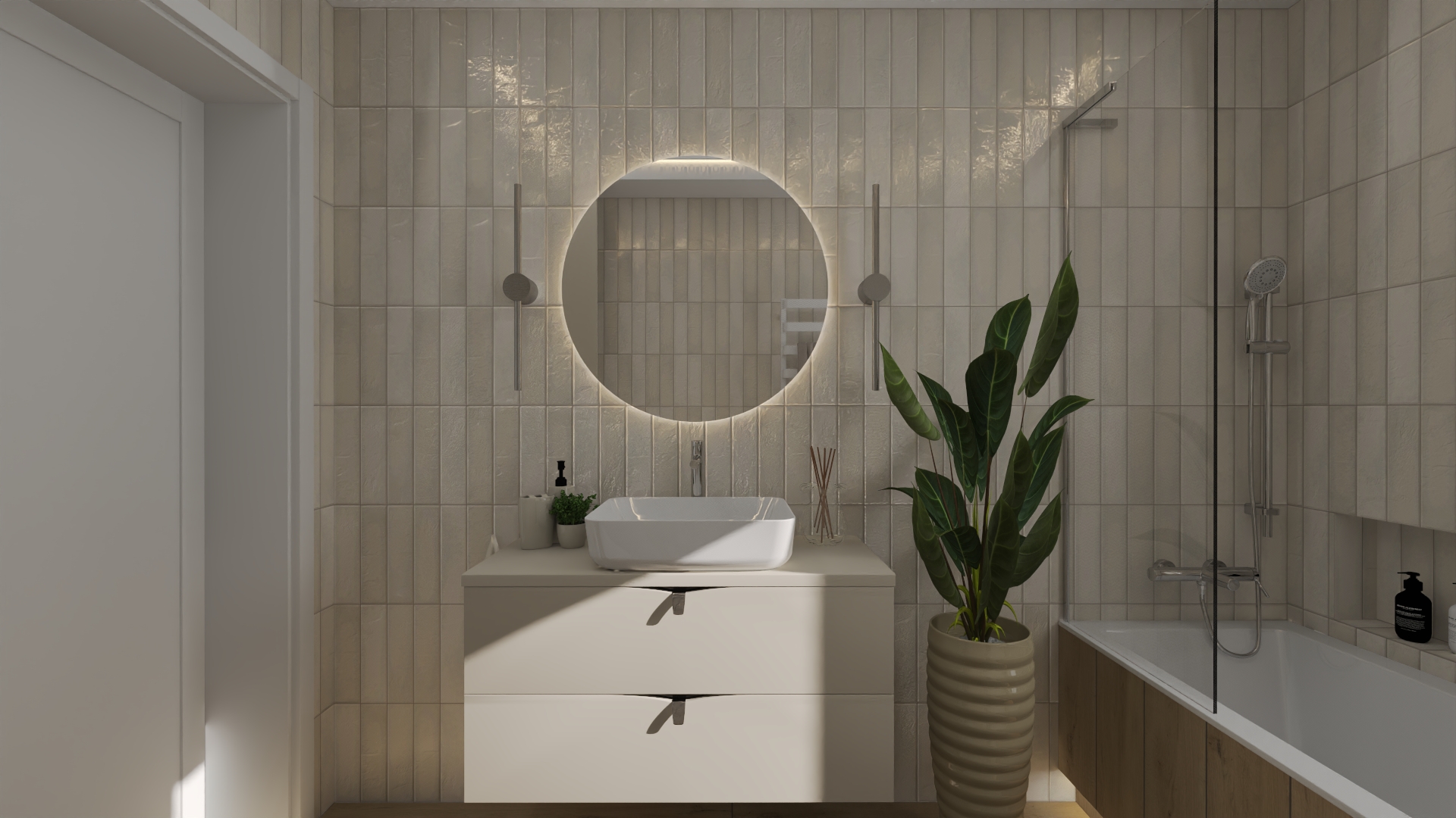 Naturalnie zrównoważona przestrzeń – ciepłe beże, delikatny połysk płytek i akcenty drewna
