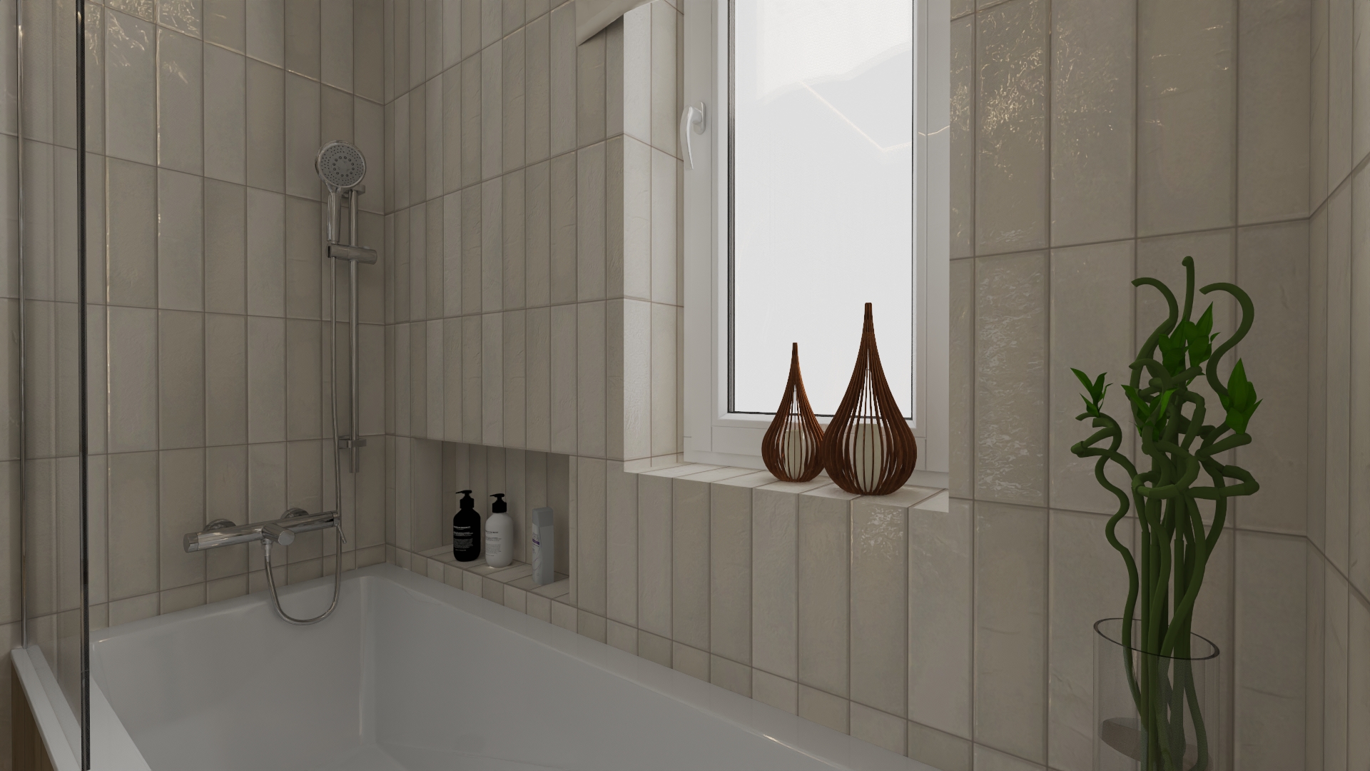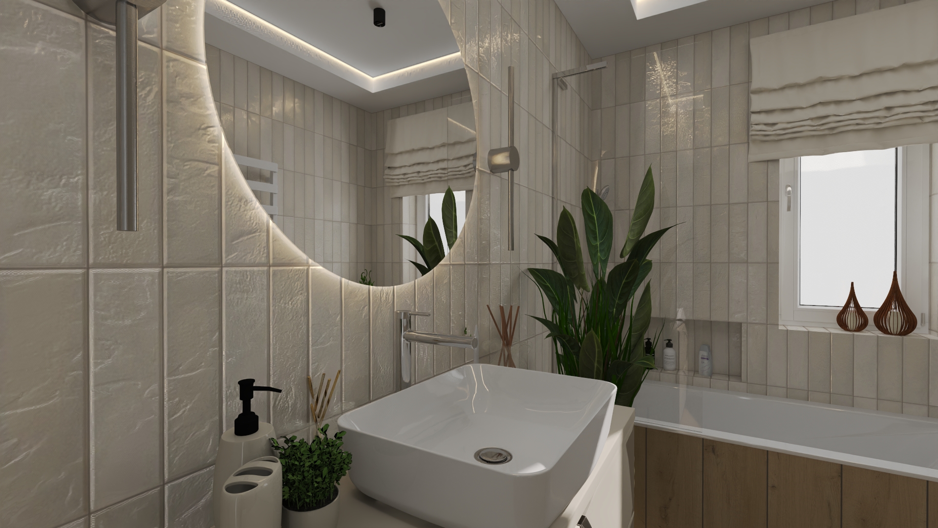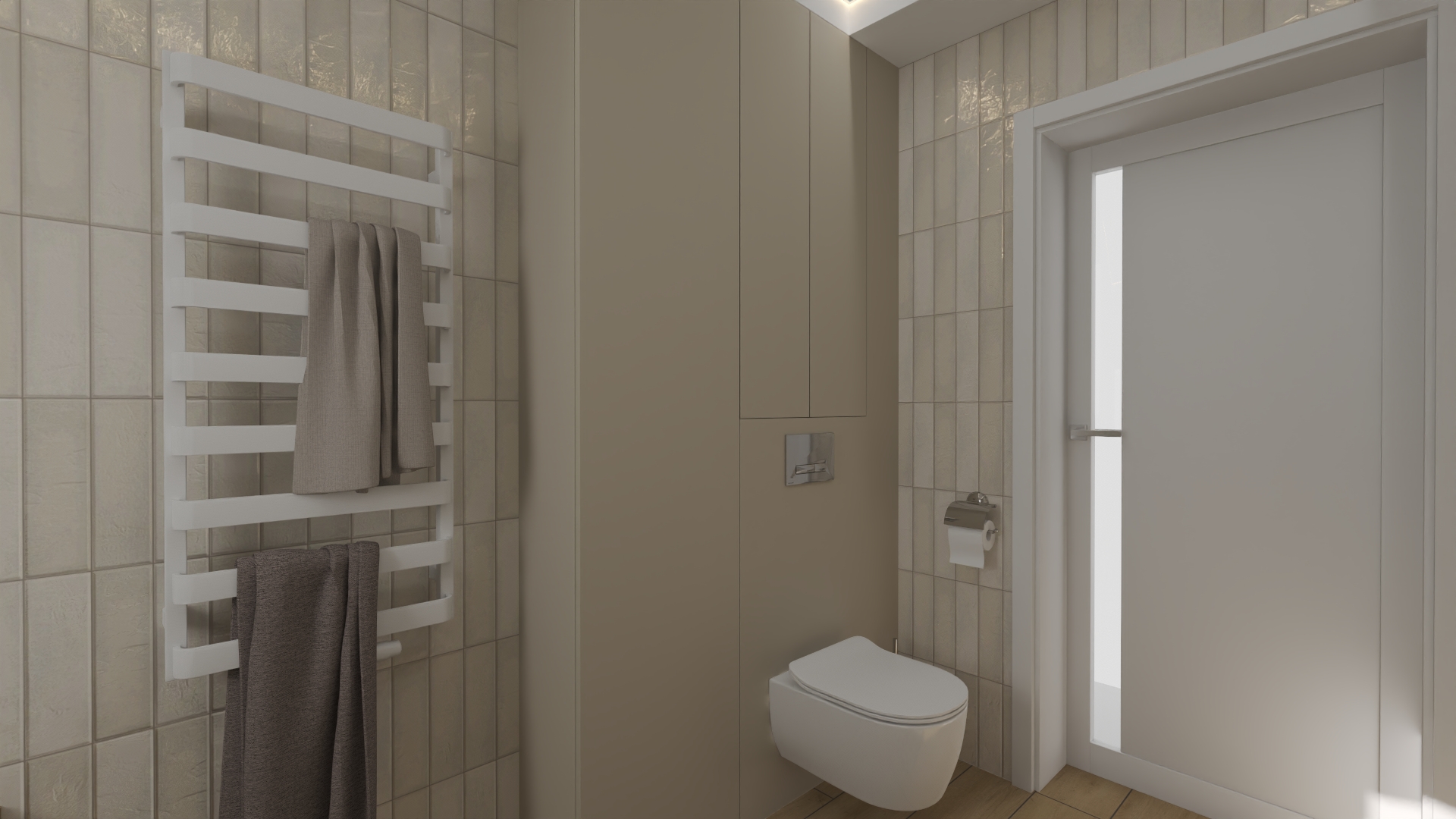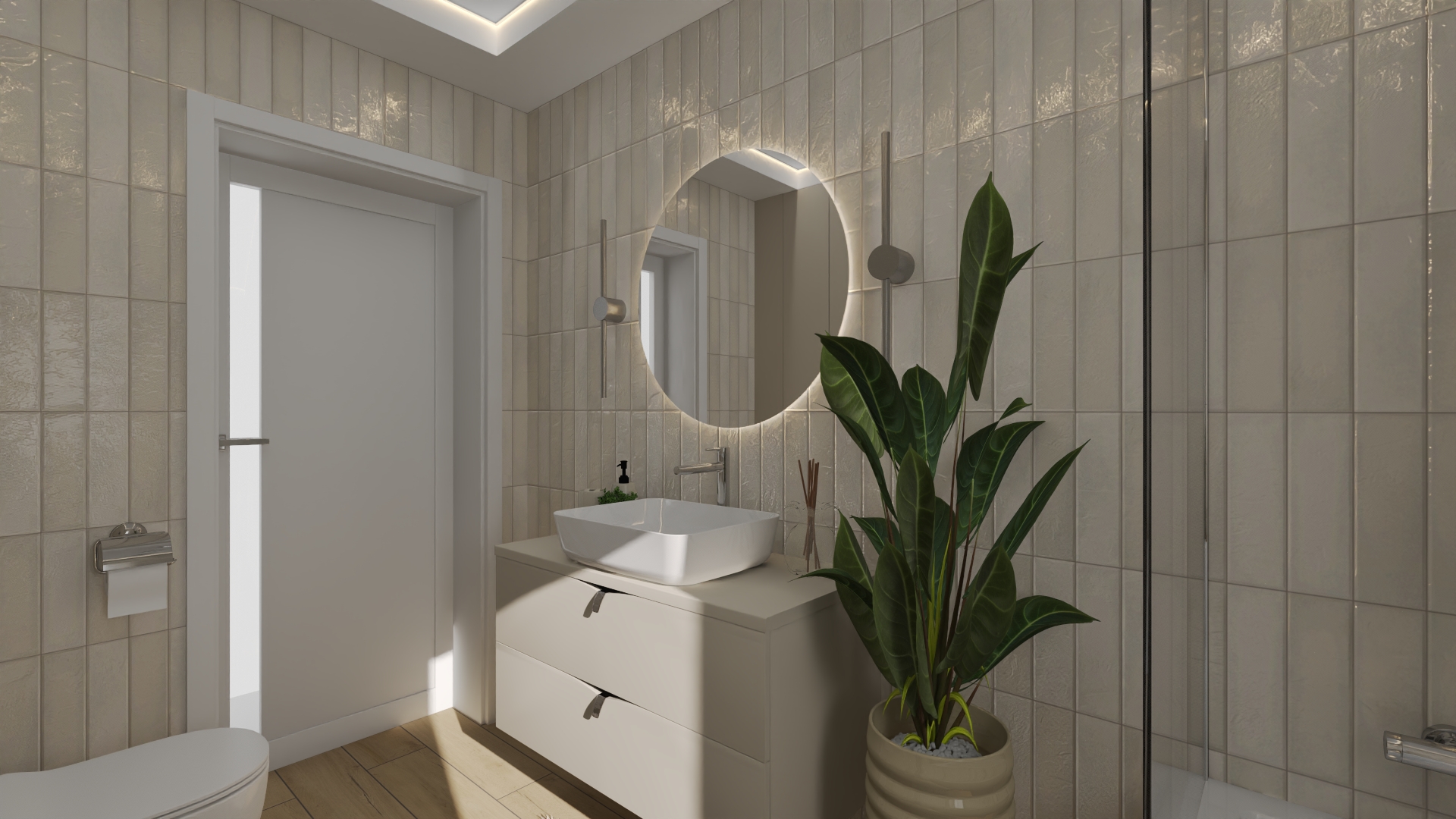 Naturalnie zrównoważona przestrzeń – ciepłe beże, delikatny połysk płytek i akcenty drewna