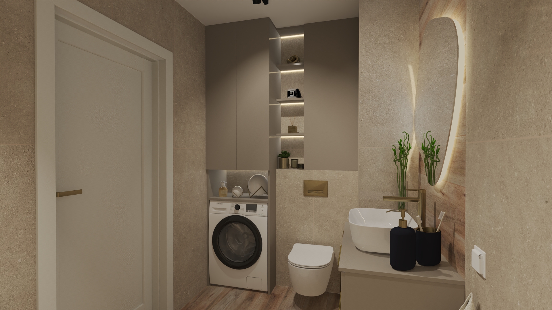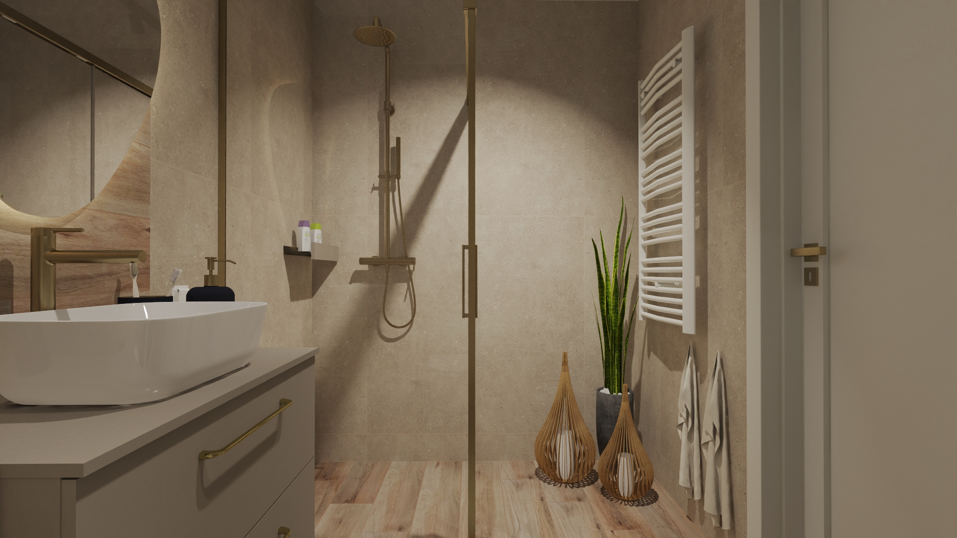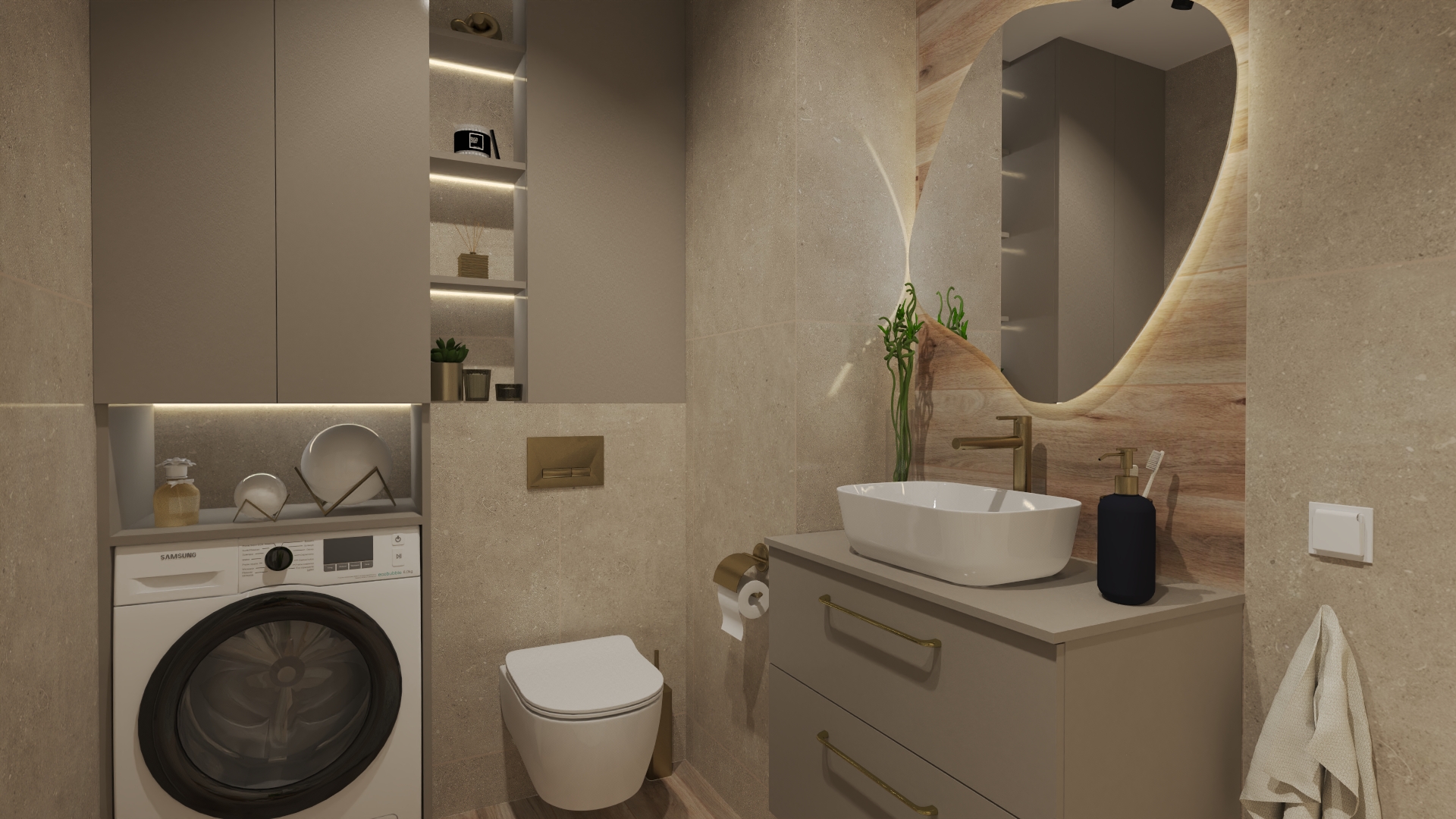 Połączenie współczesnej prostoty z ciepłem naturalnych materiałów w małej łazience