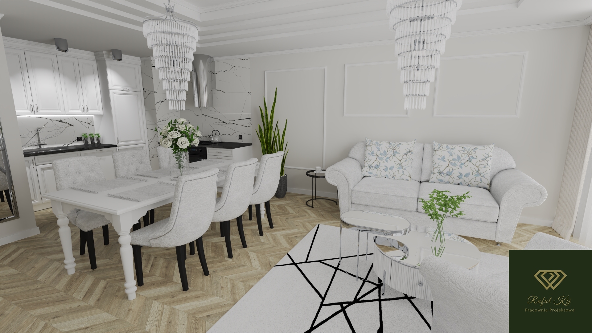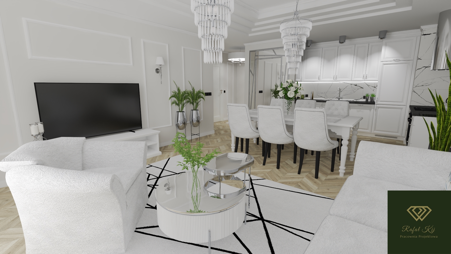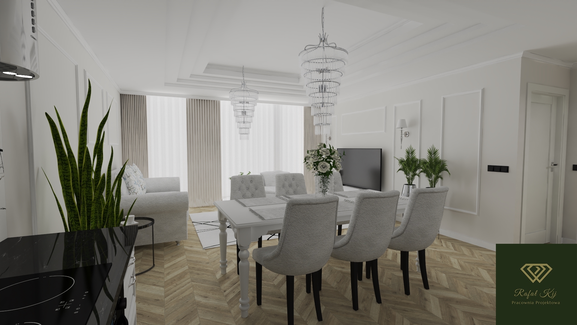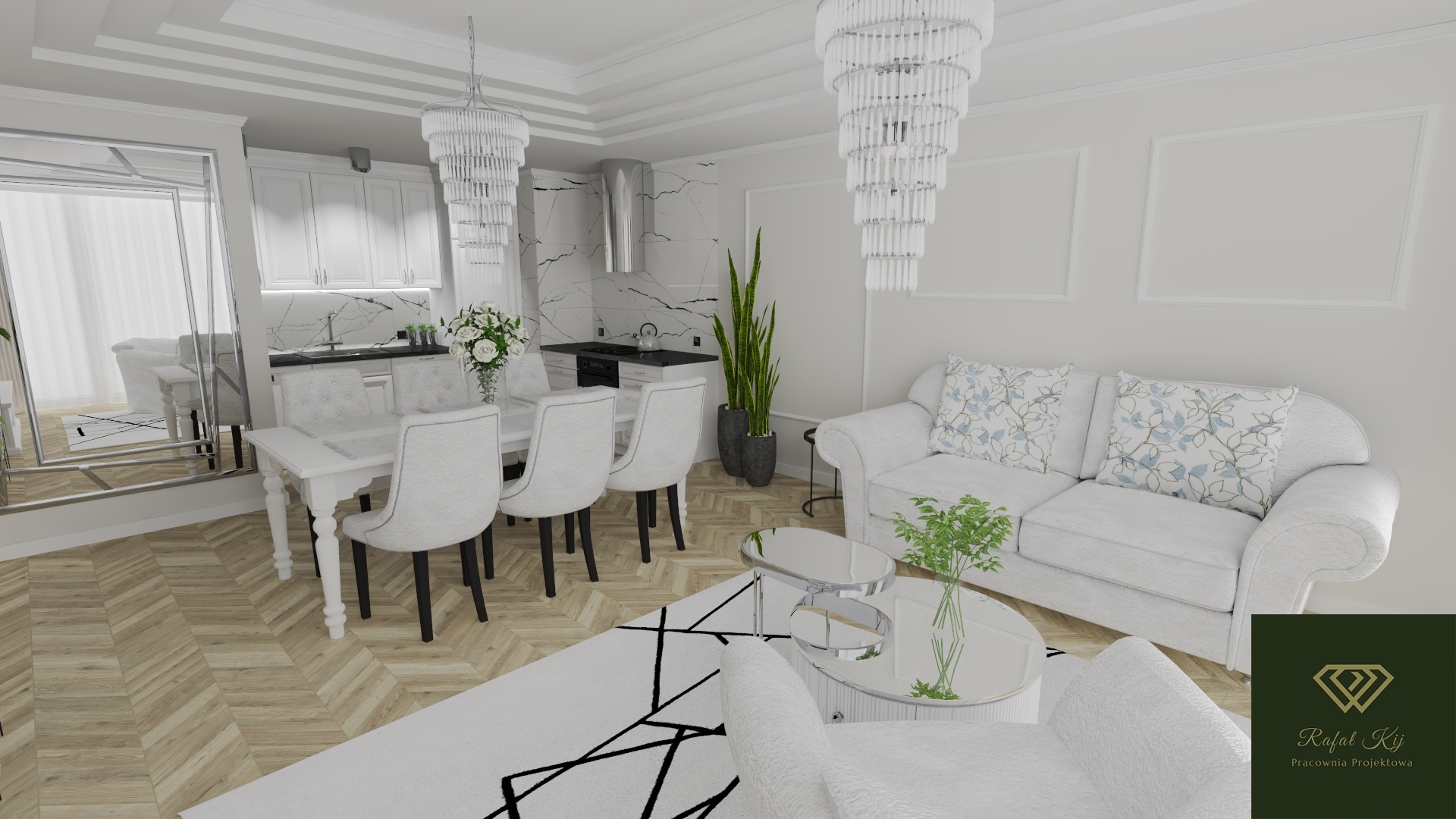 Salon z kuchnią w stylu nowoczesnej klasyki