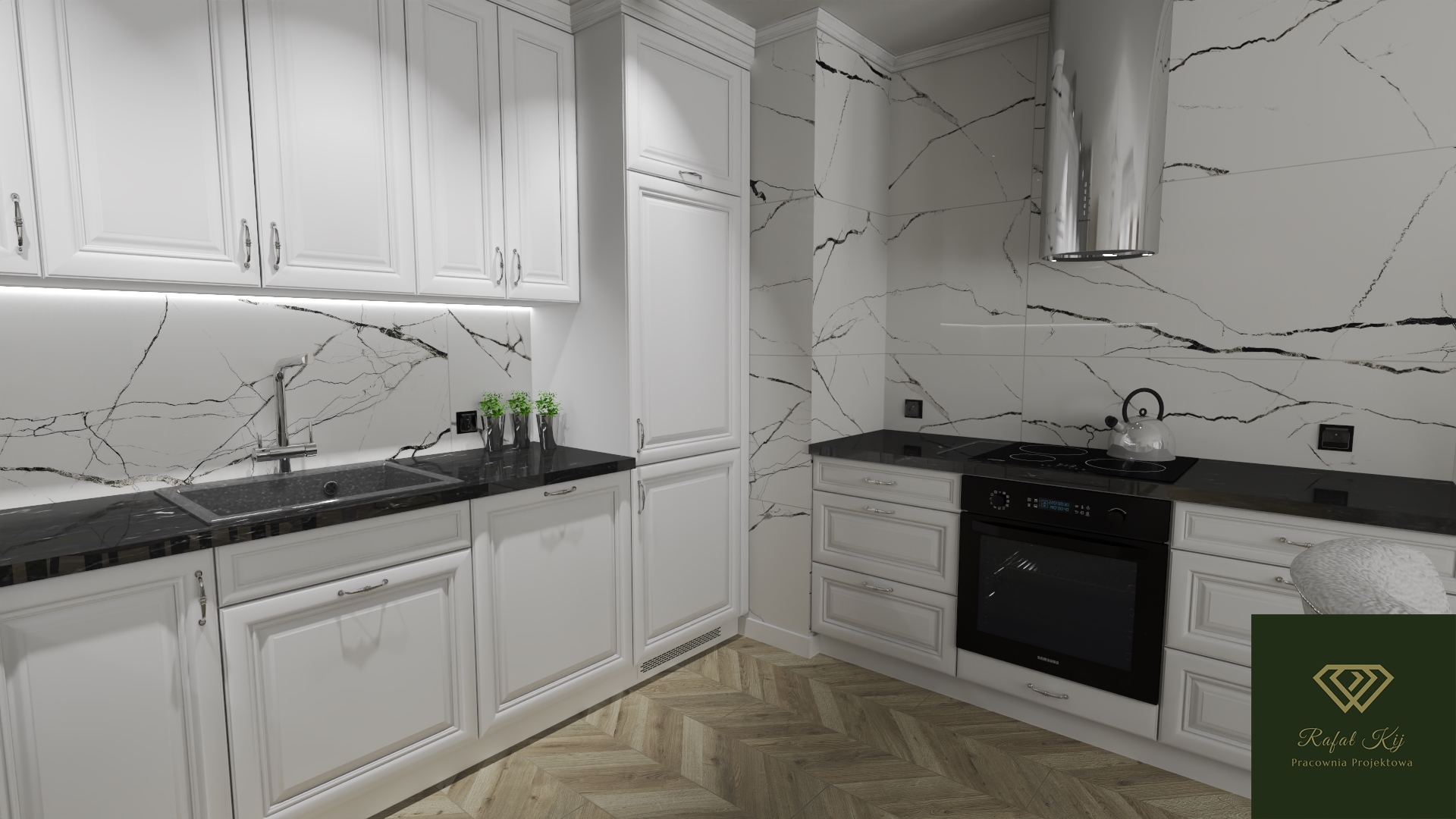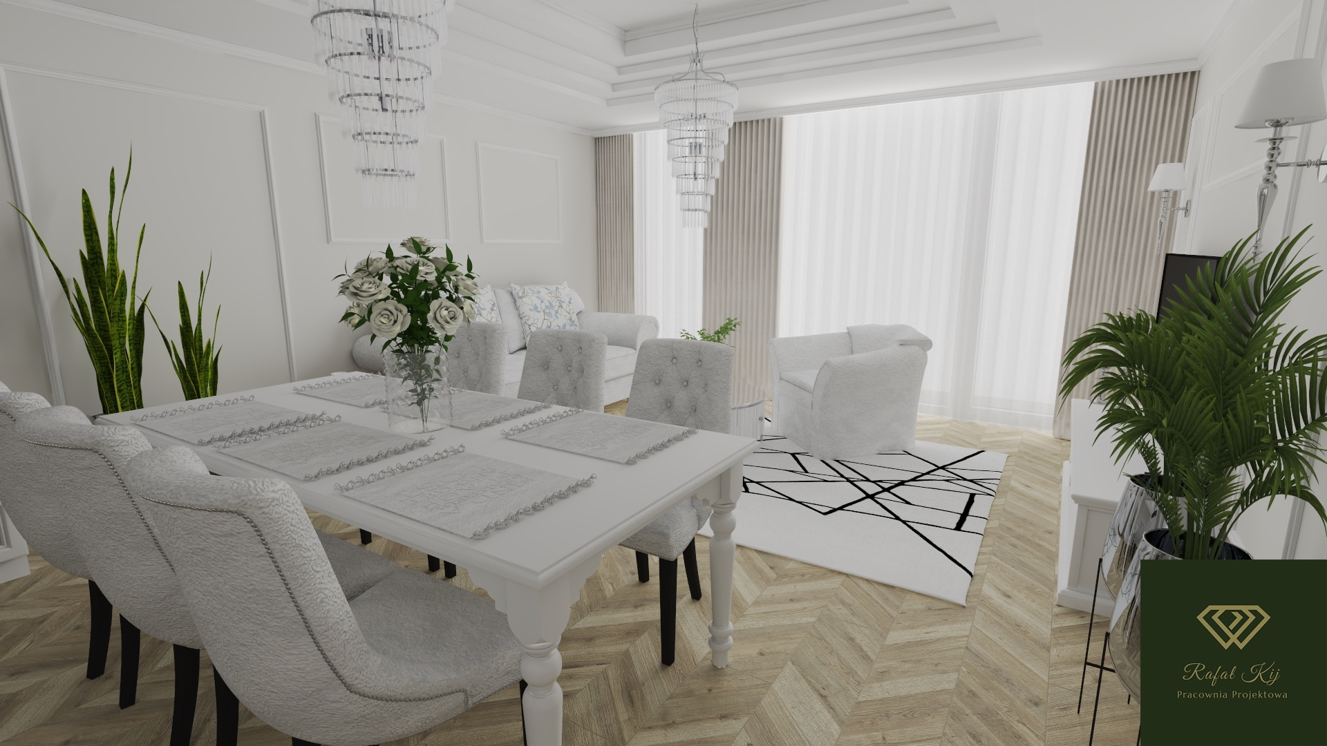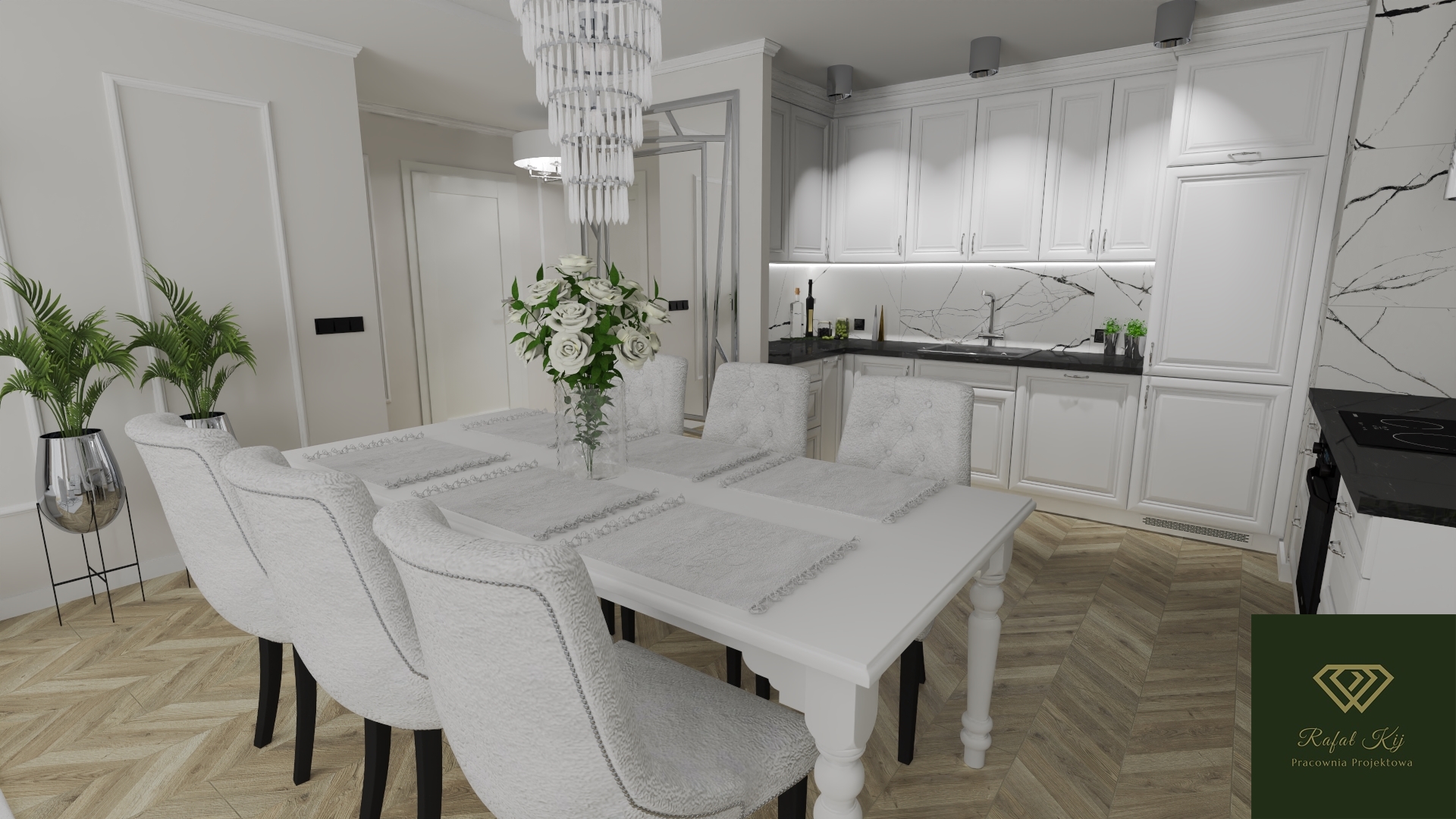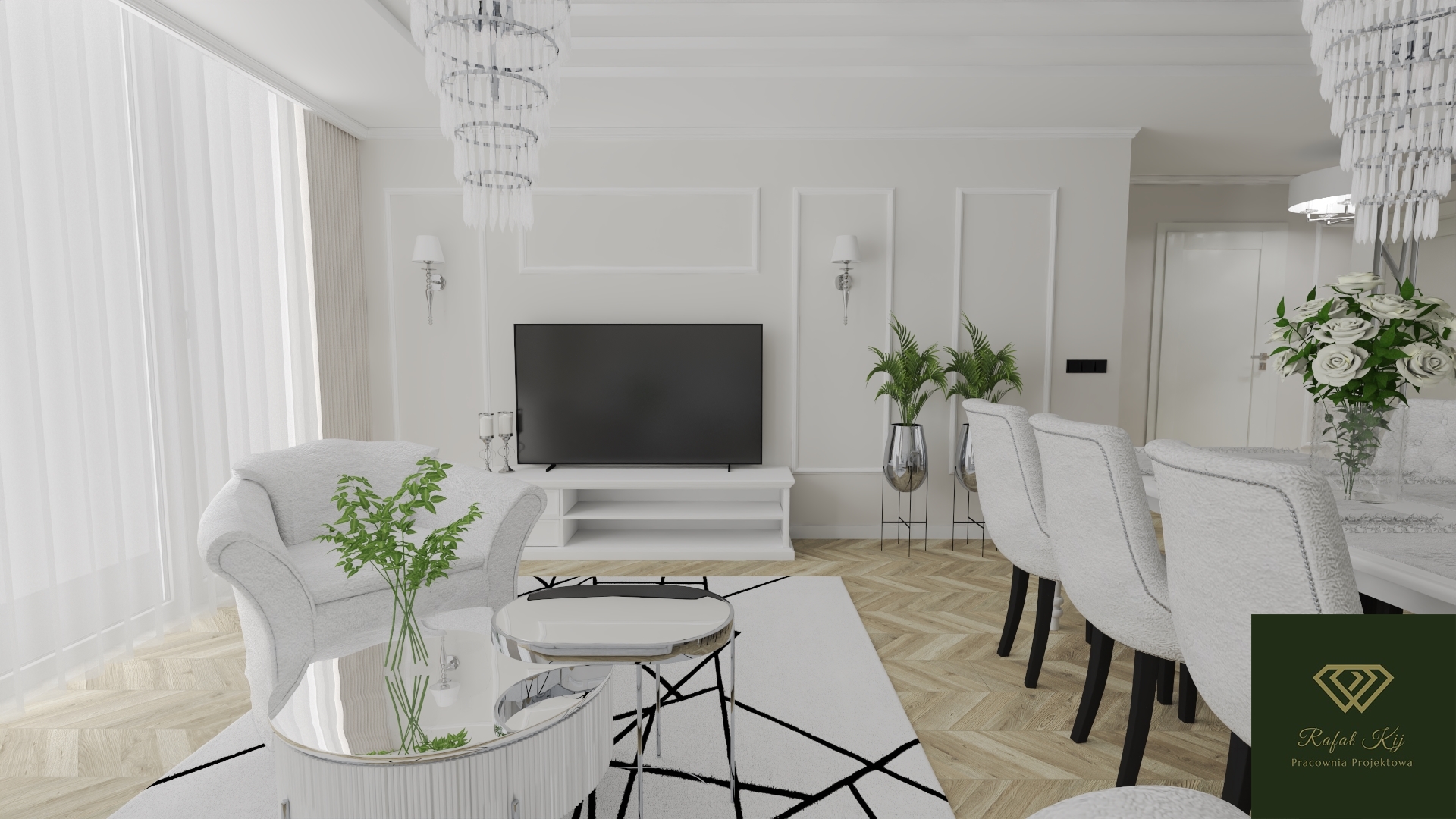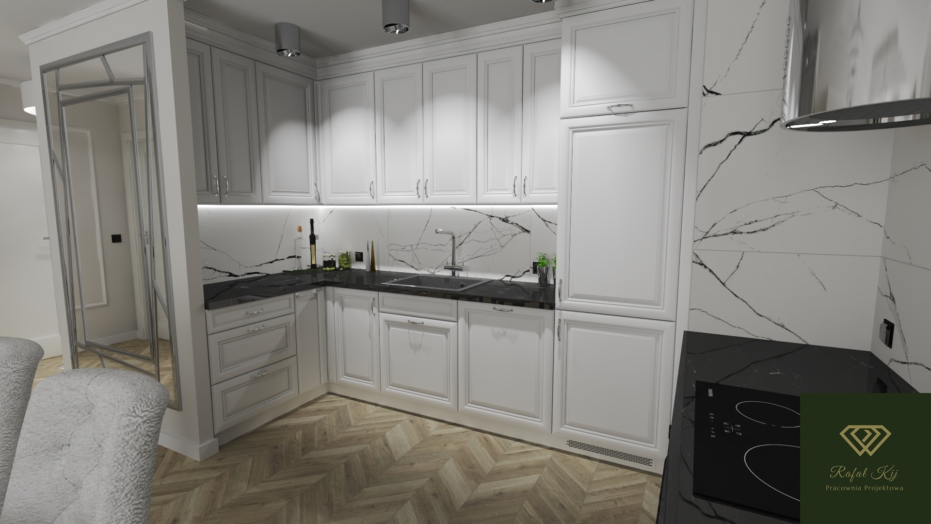 Salon z kuchnią w stylu nowoczesnej klasyki