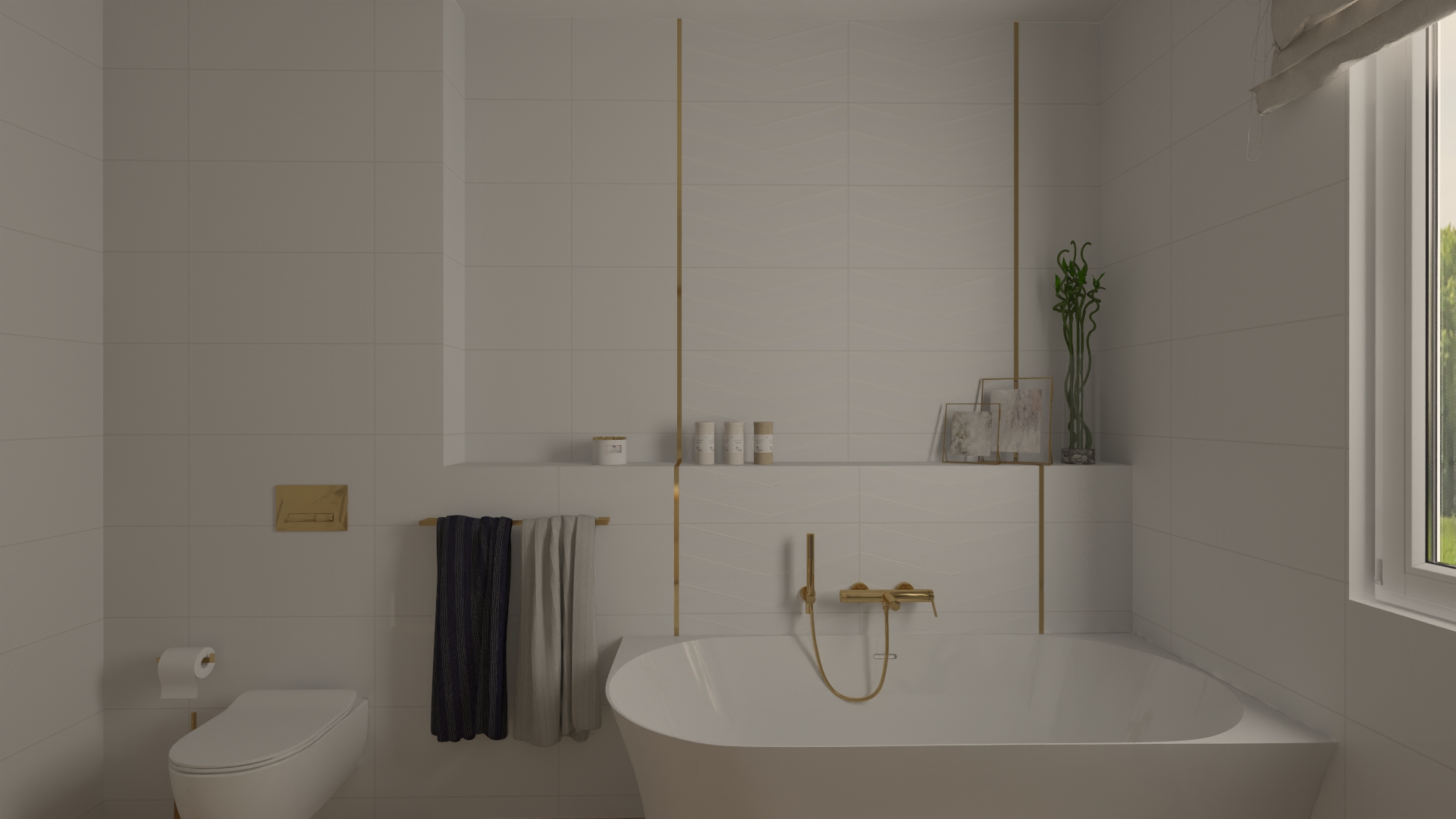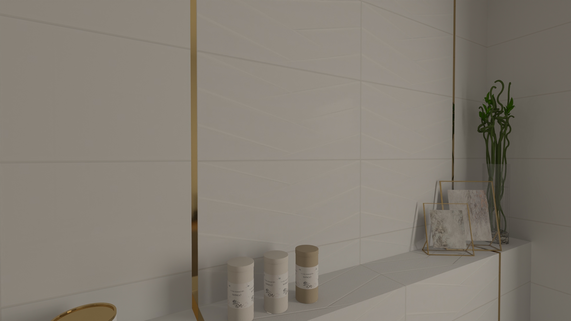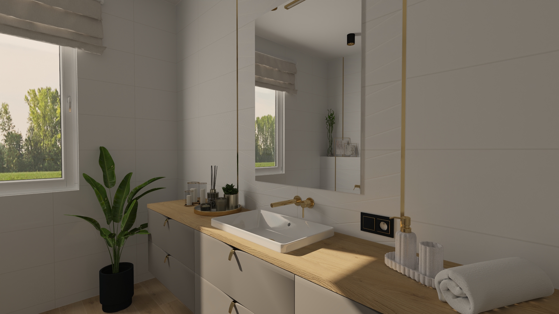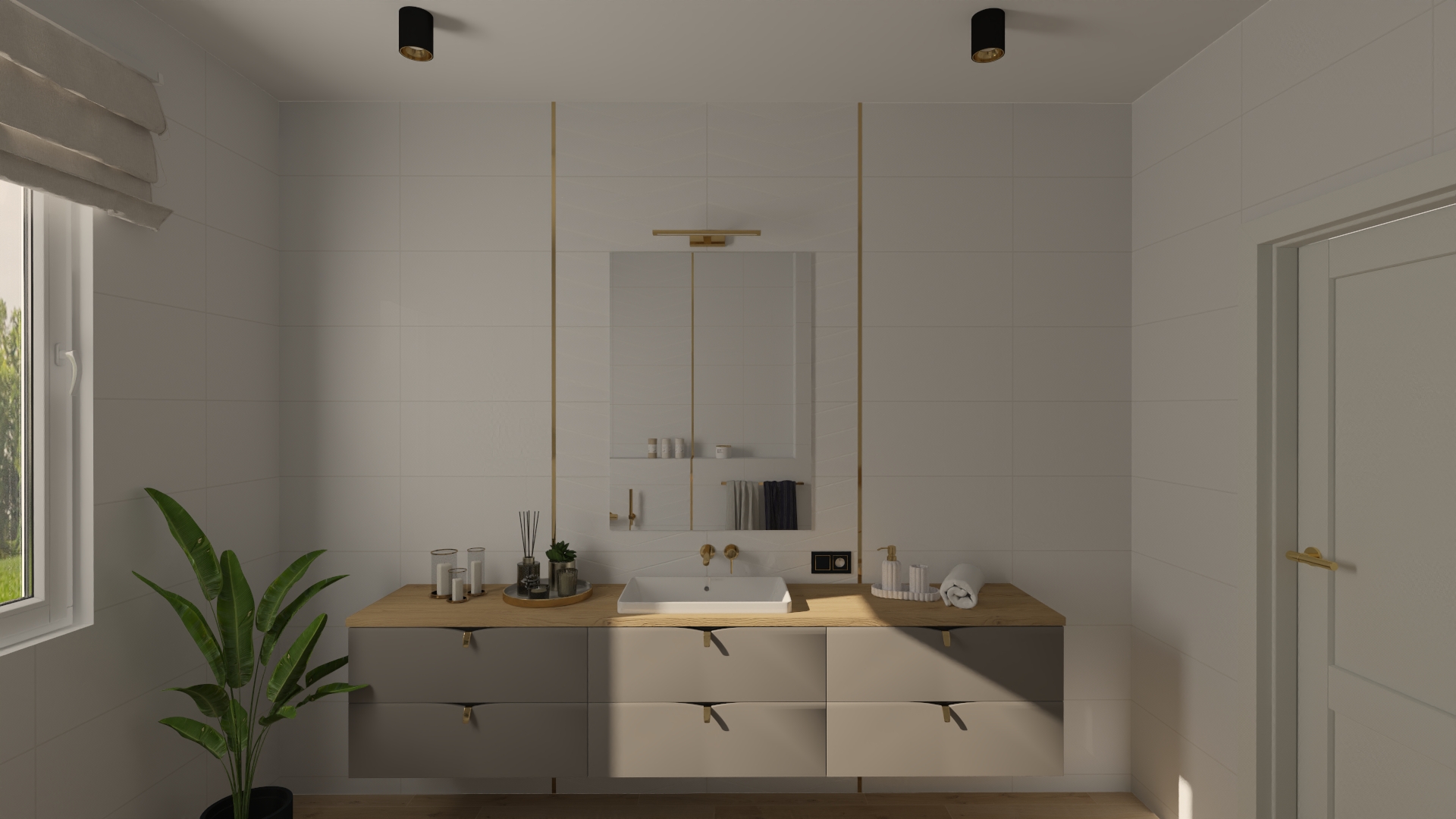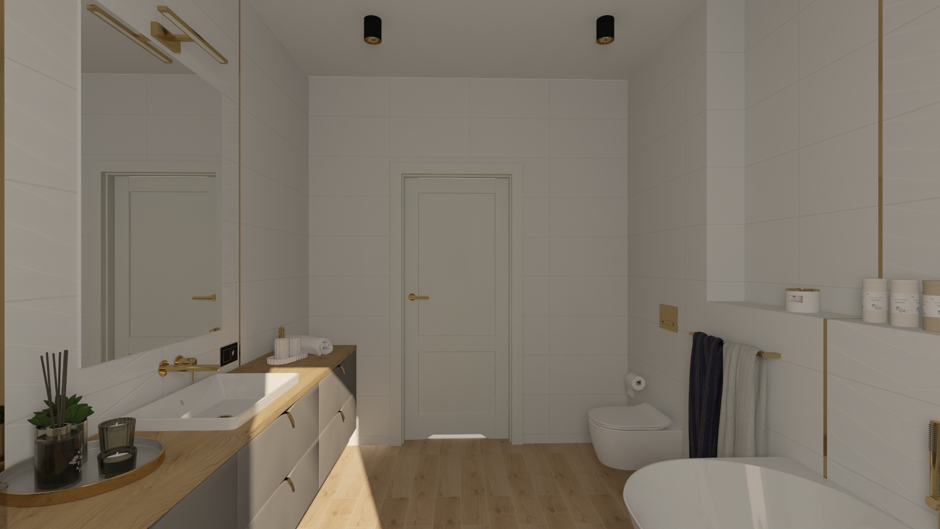 Subtelna łazienka utrzymana w tonacji bieli, złota i naturalnego drewna – idealny balans między minimalizmem a przytulnością.